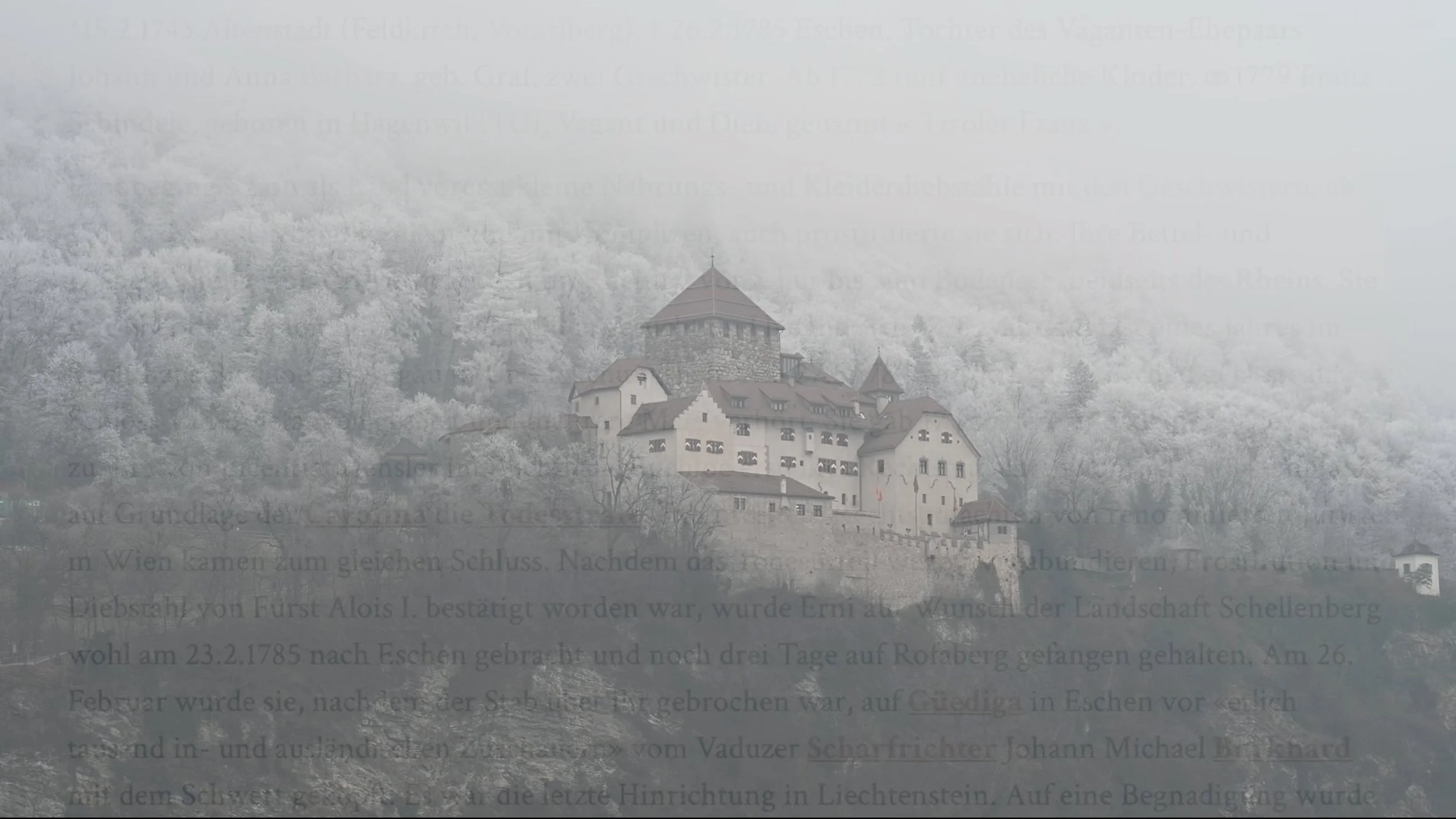 On 26 February 1785, Barbara Erni became the last person in Liechtenstein to be executed by the sword in a highly publicised spectacle on Güediga Hill – the place where I grew up. Barbara Erni was regarded a vagrant, thief and prostitute. Erni’s publicly staged execution was intended above all to serve as a deterrent and, according to sources, was witnessed by ‘several thousand local and foreign spectators’ on Güediga Hill.